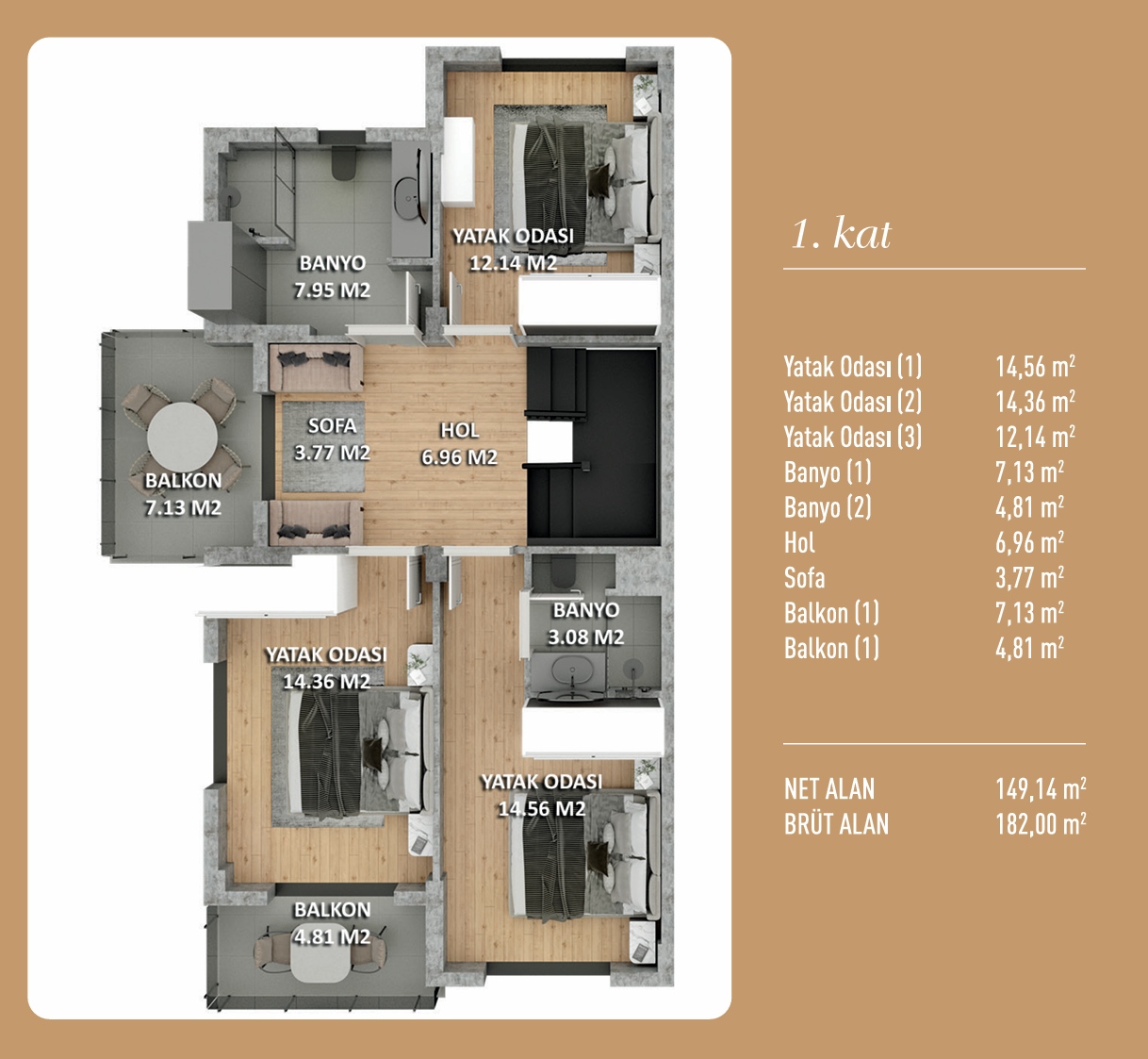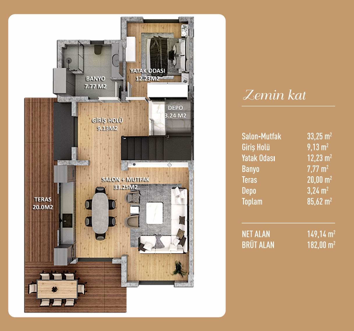 • Villalar, 360 m2’lik arsa üzerinde, net 150 m2, brüt 180 m2 kapalı alana, 300 m2 bahçe alanına sahiptir.
